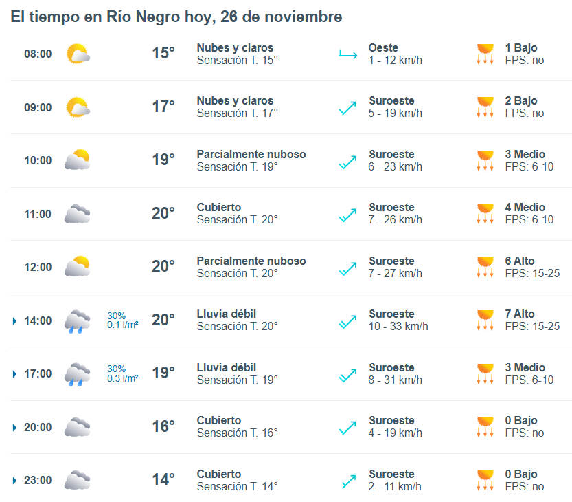 El pronóstico del tiempo para la ciudad de Río Negro, indica que hoy 26 de noviembre el cielo estará parcialmente nublado por la mañana y la temperatura rondará entre 15 grados.