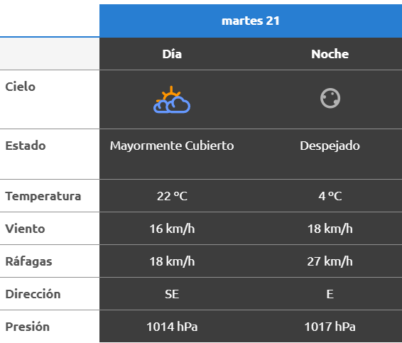 El parte del servicio meteorológico prevé que para después del mediodía el cielo estará parcialmente nublado y los vientos del sector sudoeste tendrán velocidades estimadas de entre 13 y 22 km/h. La temperatura pronosticada sería de 23 grados.