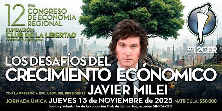 “Nos honra anunciar que el Presidente Javier Milei será el orador principal del 12º Congreso de Economía Regional del Club de la Libertad. Para debatir ‘Los desafíos del crecimiento económico’ en Argentina. Evento exclusivo presencial”.