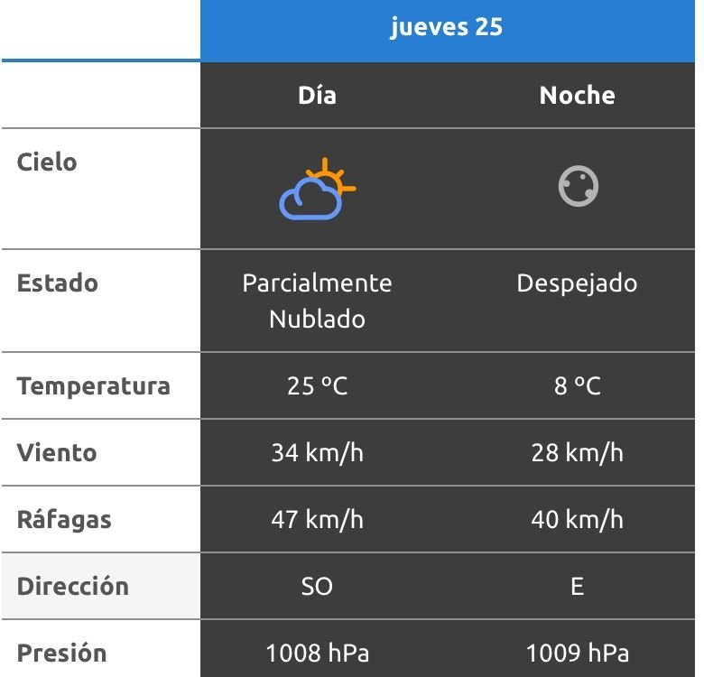 El parte del servicio meteorológico prevé que para después del mediodía el cielo estará ligeramente nublado y los vientos del sector sur tendrán velocidades estimadas de entre 23 y 31 km/h. La temperatura pronosticada sería de 24 grados.