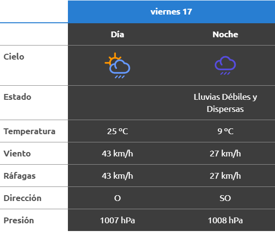 El parte del servicio meteorológico prevé que para después del mediodía el cielo estará parcialmente nublado y los vientos del sector sudoeste tendrán velocidades estimadas de entre 13 y 22 km/h. La temperatura pronosticada sería de 24 grados.