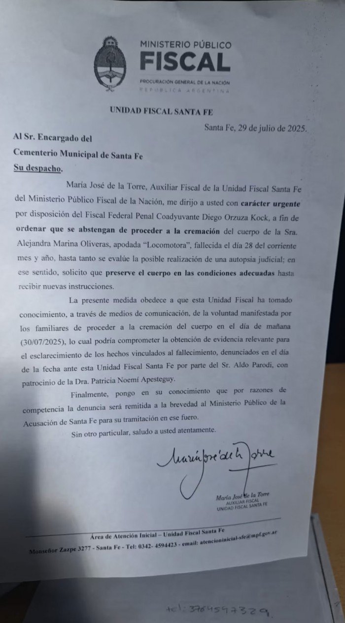 Infobae accedió al comunicado en carácter de urgente emitido por María José de la Torre, Auxiliar Fiscal de la Unidad Fiscal Santa Fe del Ministerio Público Fiscal de la Nación. En el escrito, ordenó al cementerio de la provincia que se postergue la cremación de Locomotora Oliveras por disposición del Fiscal Federal Penal Coadyuvante, Diego Orzuza Kock, “hasta tanto se evalúe la posible realización de una autopsia judicial”.