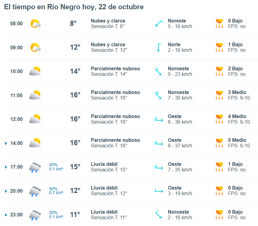 El pronóstico del tiempo para la ciudad de Río Negro, indica que hoy 22 de octubre el cielo estará con neblina por la mañana y la temperatura rondará entre 11 grados.