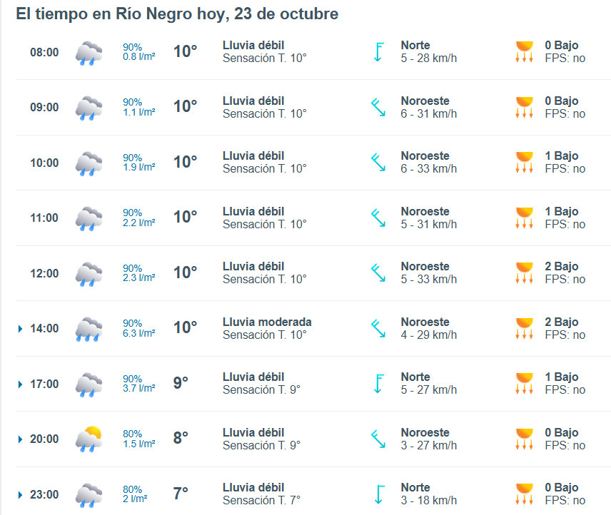 El pronóstico del tiempo para la ciudad de Viedma , indica que hoy 23 de octubre el cielo estará con lluvias aisladas por la mañana y la temperatura rondará entre 13 grados.