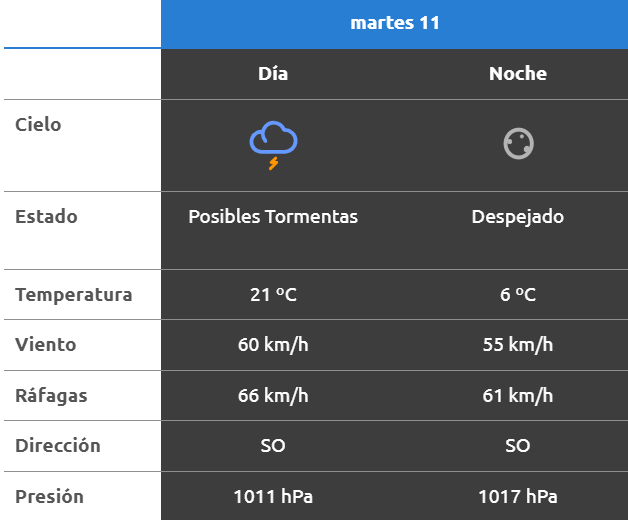 El parte del servicio meteorológico prevé que para después del mediodía el cielo estará con chaparrones y los vientos del sector sudoeste tendrán velocidades estimadas entre 32 y 41 km/h. La temperatura pronosticada sería de 21 grados.