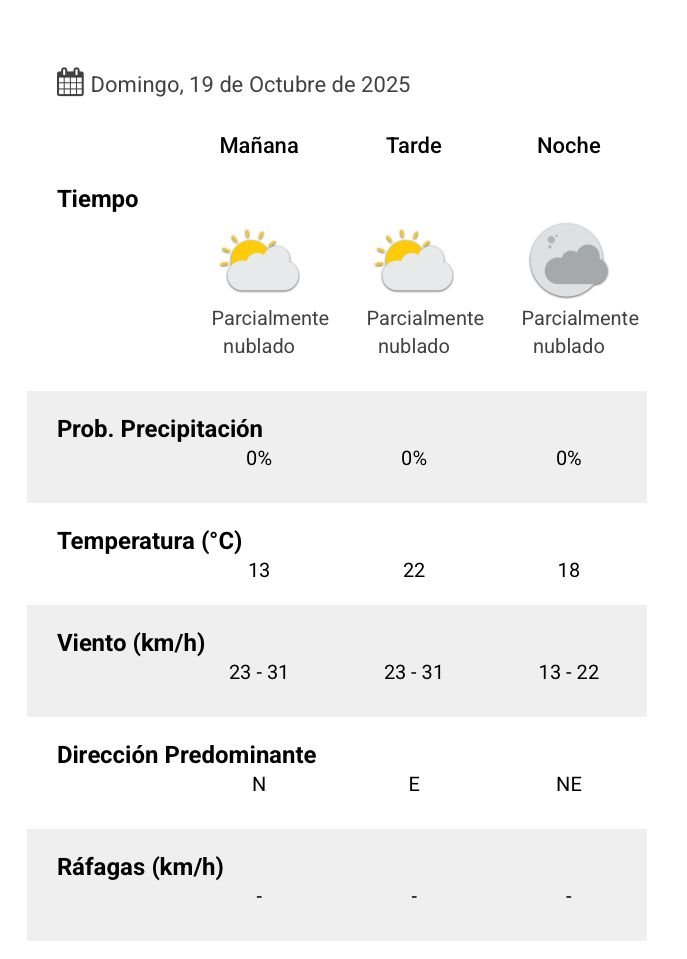 El parte del servicio meteorológico prevé que para después del mediodía el cielo estará parcialmente nublado y los vientos del sector este tendrán velocidades estimadas entre 23 y 31 km/h. La temperatura pronosticada sería de 22 grados.