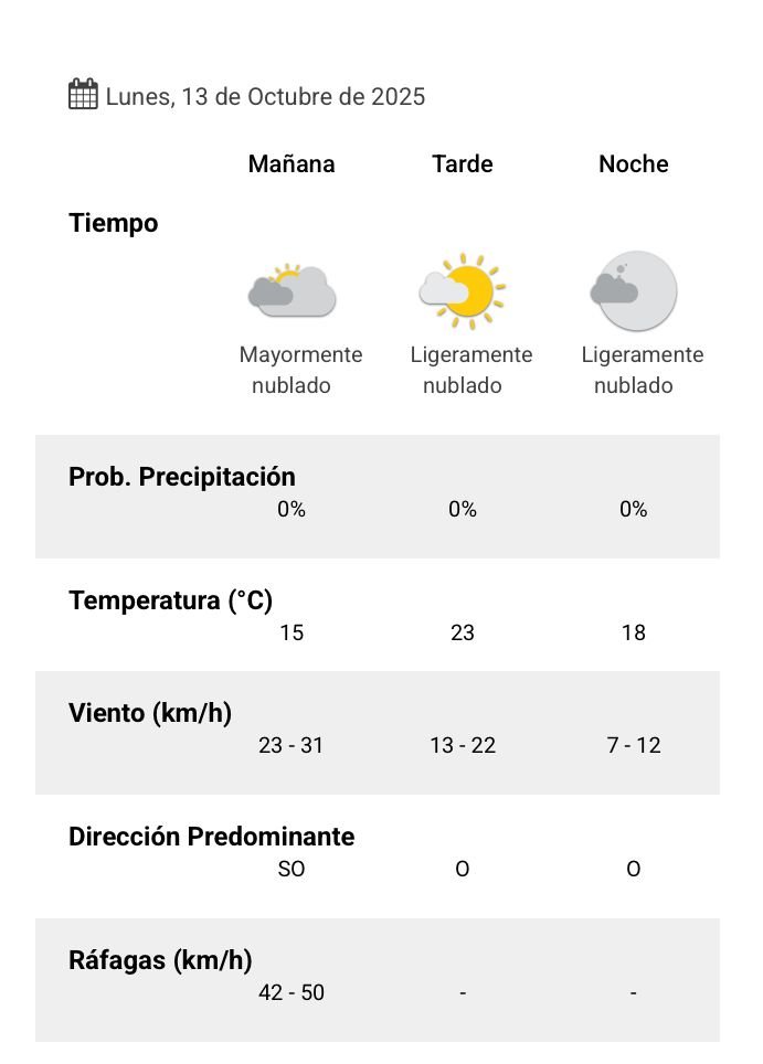 De acuerdo al parte del Servicio Meteorológico Nacional, el clima se presentaría sin lluvias, y los vientos del sudoeste correrán a una velocidad de entre 23 y 31 kilómetros por hora. La humedad sería del 91 por ciento, y la visibilidad sería buena.