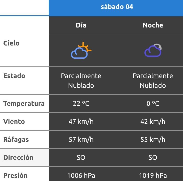 El parte del servicio meteorológico prevé que para después del mediodía el cielo estará mayormente nublado y los vientos del sector sudoeste tendrán velocidades estimadas entre 32 y 41 km/h. La temperatura pronosticada sería de 23 grados.