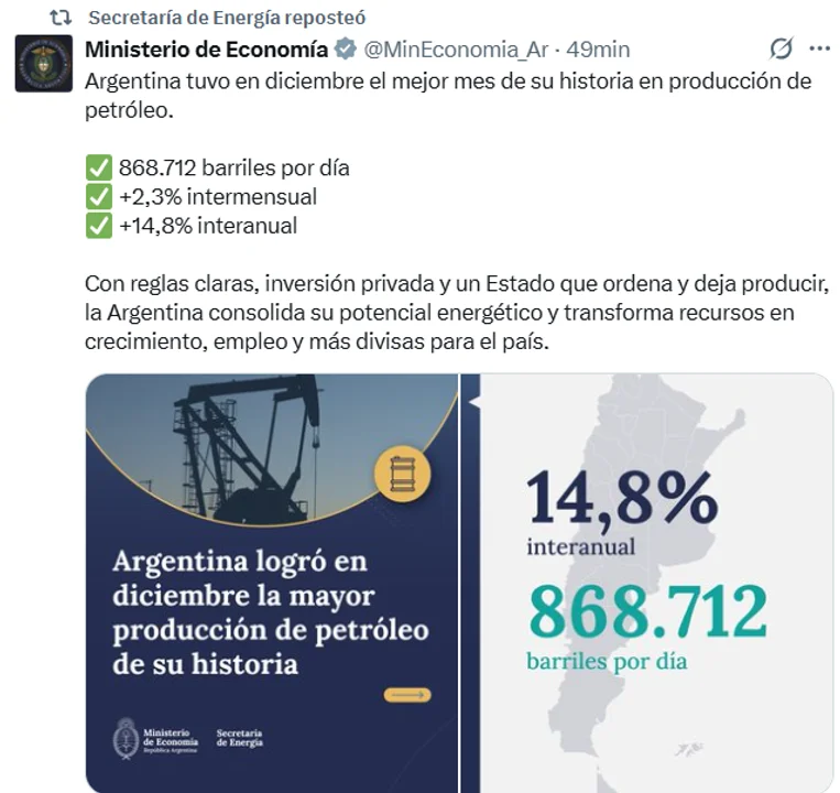 “Argentina tuvo en diciembre el mejor mes de su historia en producción de petróleo”, destacó la cartera energética a través de un comunicado, en el que atribuyó el resultado a un esquema de reglas claras, mayor inversión privada y un Estado con rol de ordenamiento.