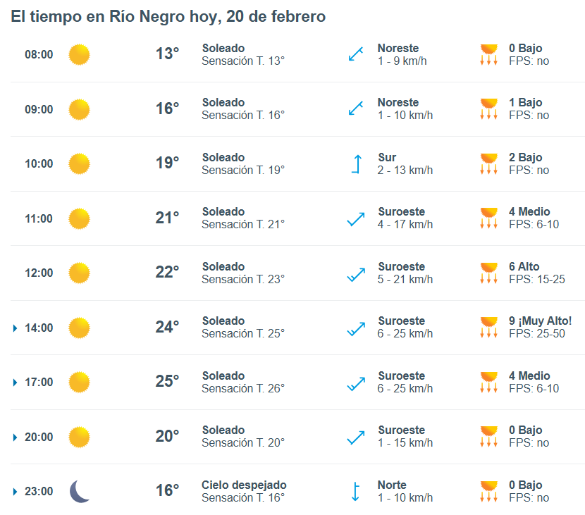 El pronóstico del tiempo para la ciudad de Río Negro, indica que hoy 20 de febrero el cielo estará parcialmente nublado por la mañana y la temperatura rondará entre 16 grados.