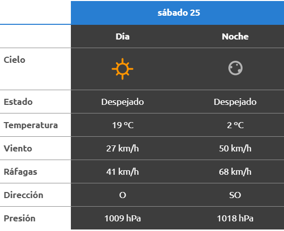 El parte del servicio meteorológico prevé que para después del mediodía el cielo estará parcialmente nublado y los vientos del sector sudoeste tendrán velocidades estimadas de entre 32 y 41 km/h. La temperatura pronosticada sería de 18 grados.