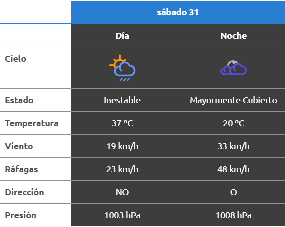 El parte del servicio meteorológico prevé que para después del mediodía el cielo estará con tormentas fuertes y los vientos del sector norte tendrán velocidades estimadas de entre 23 y 31 km/h. La temperatura pronosticada sería de 34 grados.
