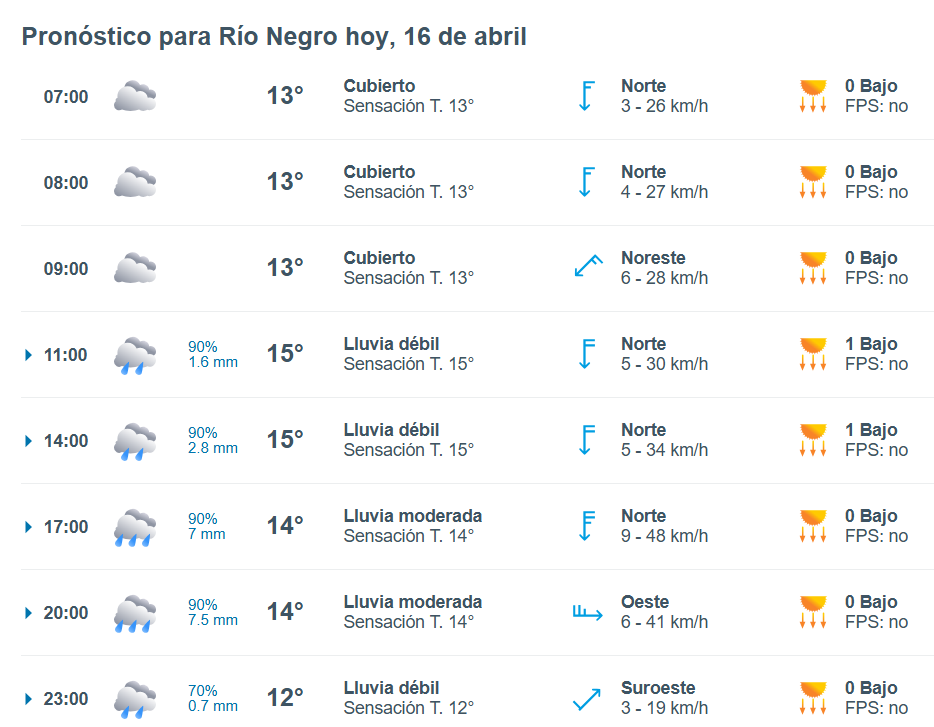 El pronóstico del tiempo para la ciudad de Río Negro, indica que hoy 16 de abril el cielo estará con lluvias aisladas por la mañana y la temperatura rondará entre 13 grados.