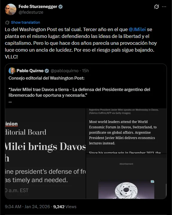 El ministro de Transformación y Desregulación del Estado, Federico Sturzenegger, se refirió a la editorial publicada por The Washington Post sobre la participación del presidente Javier Milei en el Foro Económico Mundial de Davos y expresó su pleno respaldo al contenido del artículo. “Es tal cual”, afirmó el funcionario, en línea con el análisis del medio estadounidense.