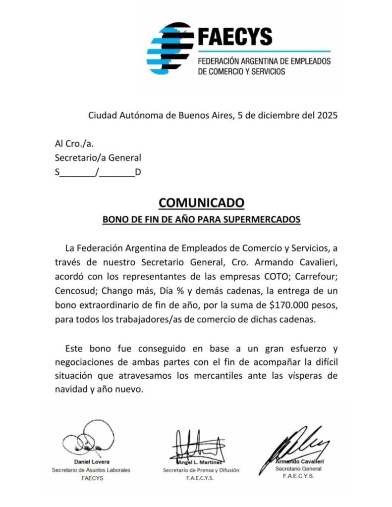 La Federación Argentina de Empleados de Comercio y Servicios (Faecys) acordó con las principales cadenas de supermercados del país un bono extraordinario de fin de año de $170.000 para todos los trabajadores del sector.