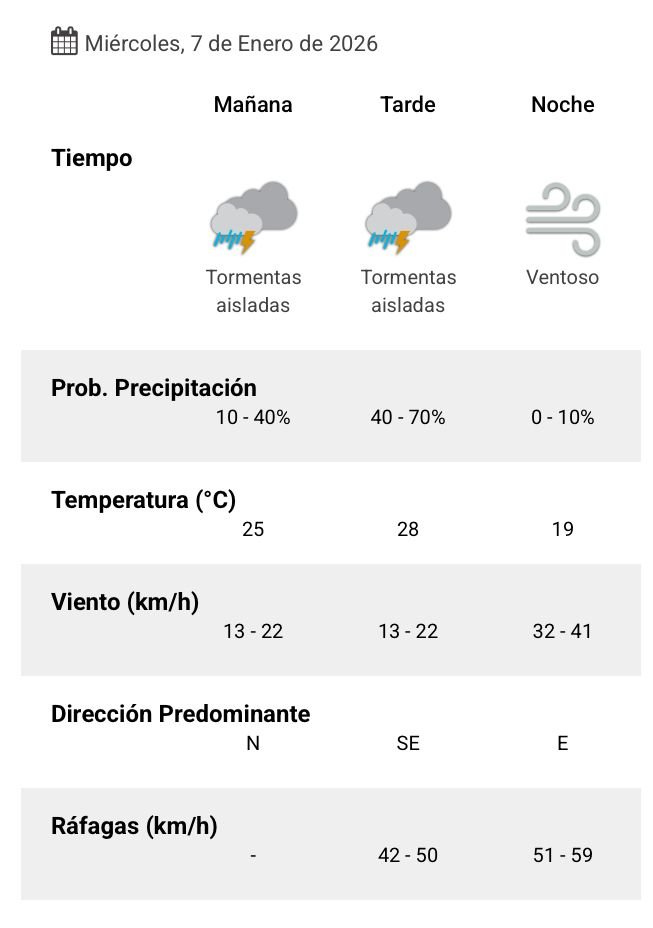 De acuerdo al parte del Servicio Meteorológico Nacional, el clima presenta una probabilidad de lluvia entre el 10 y 40 por ciento, y los vientos del norte correrán a una velocidad de entre 13 y 22 kilómetros por hora. La humedad sería del 31 por ciento, y la visibilidad sería regular.