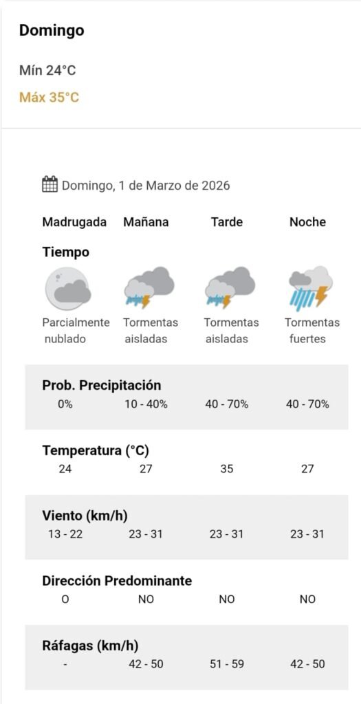 El parte del servicio meteorológico prevé que para después del mediodía el cielo estará con tormentas aisladas y los vientos del sector noroeste tendrán velocidades estimadas de entre 23 y 31 km/h. La temperatura pronosticada sería de 35 grados.