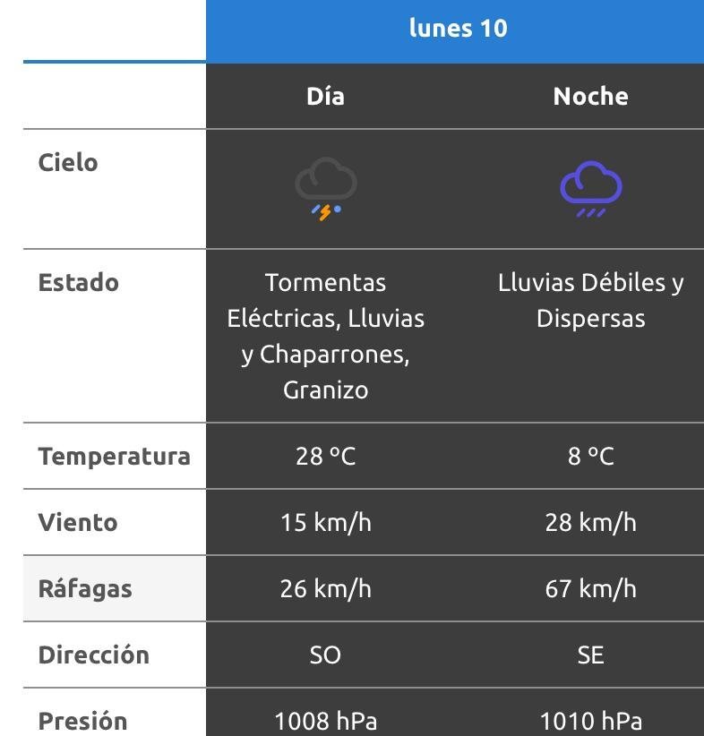 El parte del servicio meteorológico prevé que para después del mediodía el cielo estará con tormentas fuertes y los vientos del sector noroeste tendrán velocidades estimadas entre 23 y 31 km/h. La temperatura pronosticada sería de 24 grados.