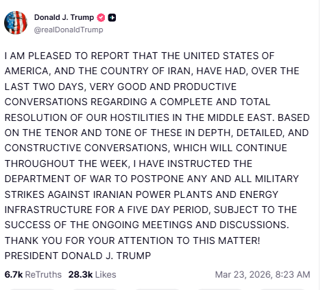 El presidente de Estados Unidos, Donald Trump, confirmó a través de su cuenta en Truth Social que suspenderá temporalmente cualquier acción militar contra la infraestructura energética de Irán durante cinco días, en el marco de negociaciones que buscan una resolución completa del conflicto.