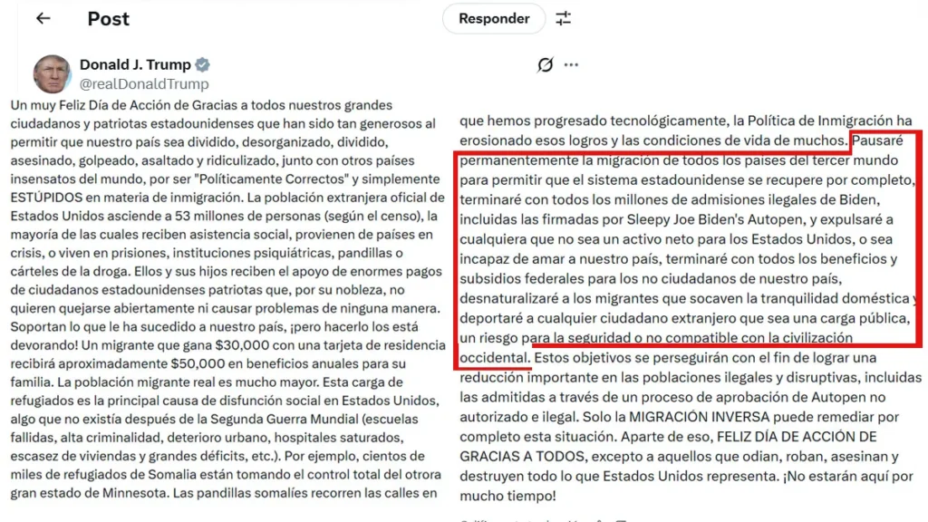 “Suspenderé permanentemente la migración desde todos los países del Tercer Mundo para permitir que el sistema estadounidense se recupere por completo”, escribió en su cuenta personal.