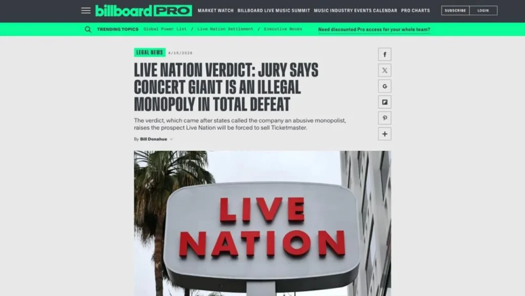 Un jurado federal de Estados Unidos determinó que Live Nation Entertainment, propietaria de Ticketmaster, incurrió en prácticas monopólicas ilegales dentro del mercado de venta de entradas y organización de conciertos, en un fallo considerado clave para la industria del entretenimiento.