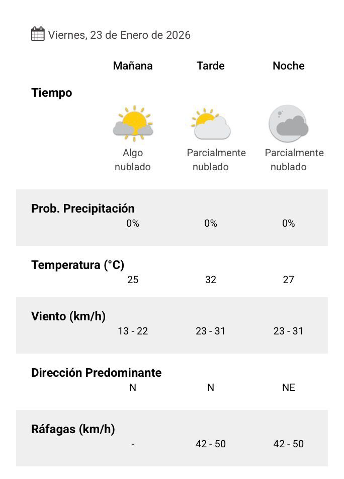 El parte del servicio meteorológico prevé que para después del mediodía el cielo estará parcialmente nublado y los vientos del sector norte tendrán velocidades estimadas entre 23 y 31 km/h. La temperatura pronosticada sería de 32 grados.