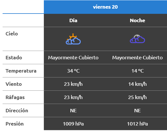El parte del servicio meteorológico prevé que para después del mediodía el cielo estará mayormente nublado y los vientos del sector norte tendrán velocidades estimadas de entre 23 y 31 km/h. La temperatura pronosticada sería de 33 grados.