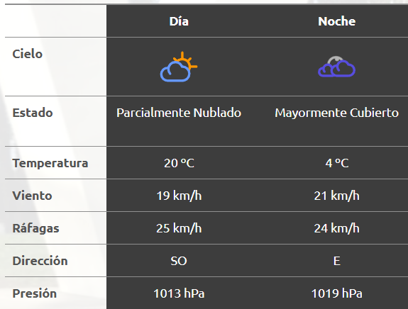 El parte del servicio meteorológico prevé que para después del mediodía el cielo estará mayormente nublado y los vientos del sector oeste tendrán velocidades estimadas de entre 32 y 41 km/h. La temperatura pronosticada sería de 17 grados.