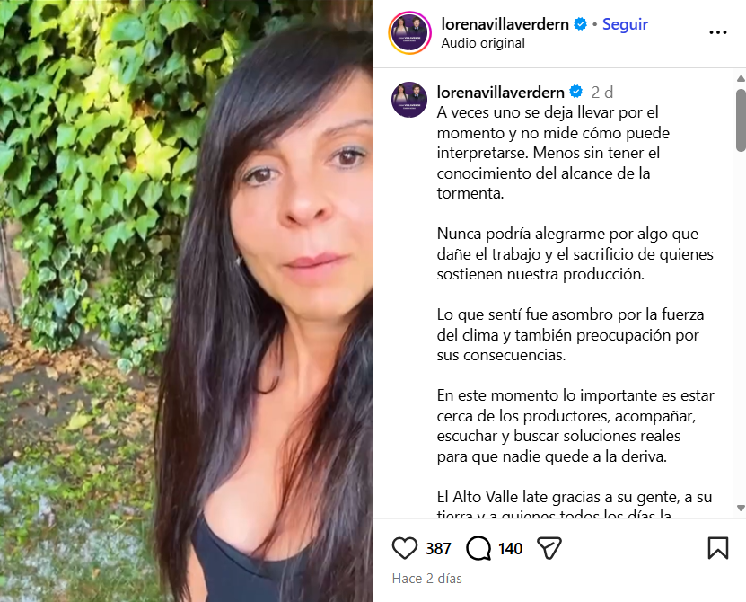Ante las críticas, la legisladora publicó un segundo video en el que buscó aclarar sus dichos y pidió disculpas: “A veces uno se deja llevar por el momento y no mide cómo puede interpretarse. Menos sin tener el conocimiento del alcance de la tormenta. Nunca podría alegrarme por algo que dañe el trabajo y el sacrificio de quienes sostienen nuestra producción”, expresó Villaverde.