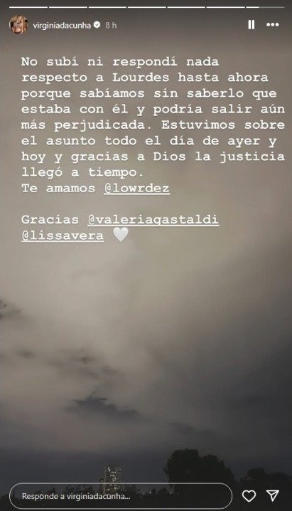 La jornada de tensión por la desaparición de Lowrdez Fernández llegó a su fin cuando se confirmó que la exintegrante de Bandana se encontraba fuera de peligro. Su amiga y compañera de banda, Virginia da Cunha, recurrió a las redes sociales para manifestar su felicidad y tranquilidad.
